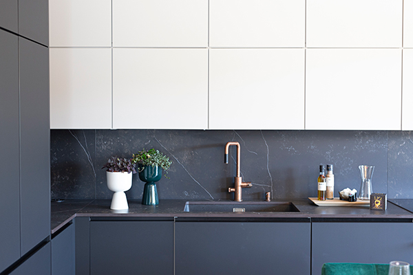 A matte black kitchen, black tap and black sink as well as Dekton worktops