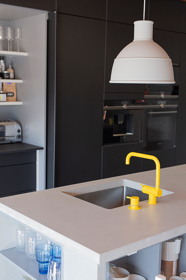 The dark kitchen has concrete worktops and a gorgeous yellow tap.