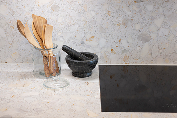 Stone worktops came in light patterned quartz, limestone and terrazzo. We also saw dark worktops with large patterns.