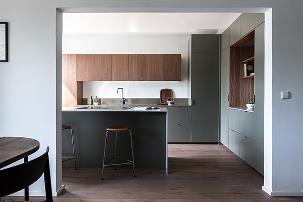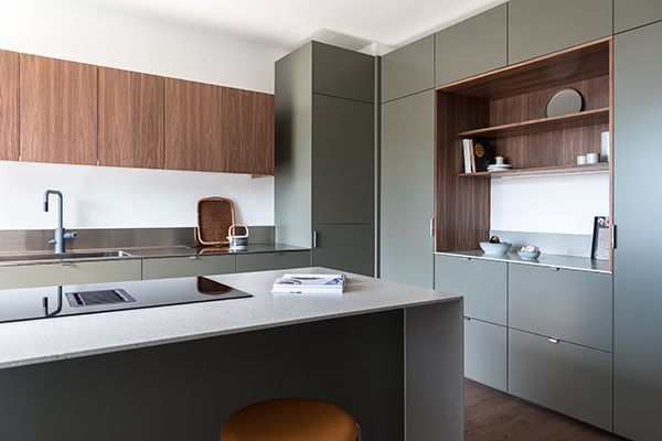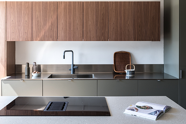 The stunningly gorgeous, modern kitchen combines dark-toned walnut veneer, green cabinet doors and Stala’s Tailor-made steel countertop.