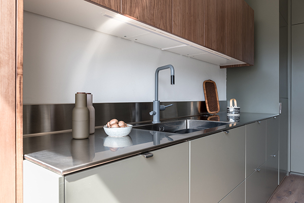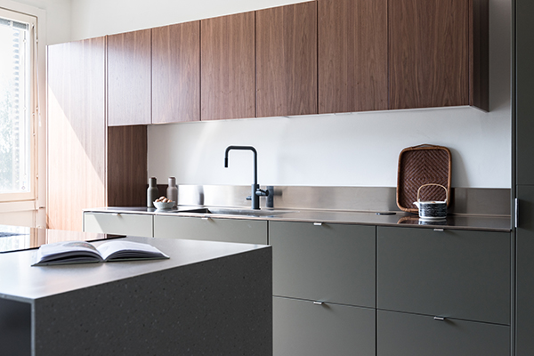 Stainless-steel is a user-friendly material since it is easy to clean and offers good water-leak safety. The overall impression can be easily softened by combining stainless-steel countertop with, for example, walnut veneer. In this kitchen, stainless steel countertops are nicely paired with Corian composite countertops in Willow tones. Composite countertops allow for marks from years of use to be sanded away if necessary. Combining different stainless steel materials makes the whole kitchen lighter and airier. You get a harmonised look by selecting all countertops with the same thickness (12mm in this kitchen), with the same corner angles and as seamless versions. Thin countertops create a modern overall impression. Raised back edges are 15cm high in both countertops. The look and feel of your kitchen is easy and inexpensive to improve, for example, by renewing just the countertops – even this kind of light version of a facelift can be done with Doorie.