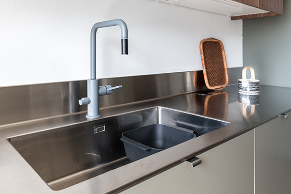 The stunningly gorgeous stainless steel worktop with raised back edge is made of one piece without any seams – this increases water leak safety.