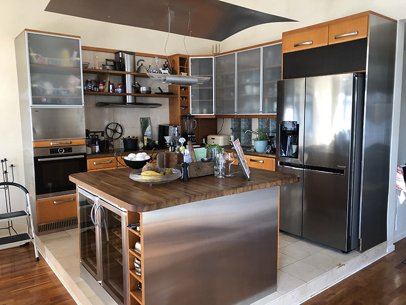 A 25-year-old kitchen in need of an update. Steel was already an important element in the kitchen. The material was used, for example, in the tall side panels, island and ceiling lamp.