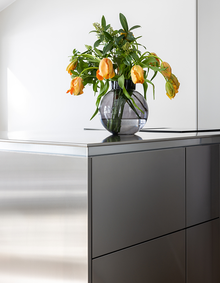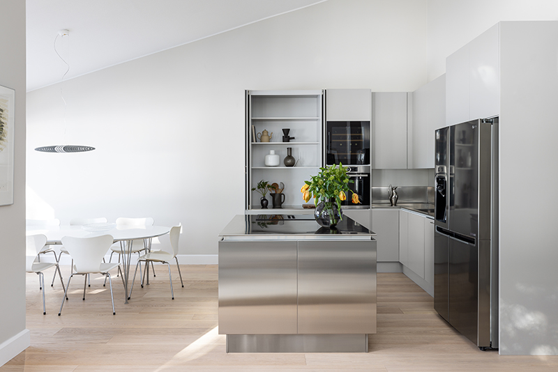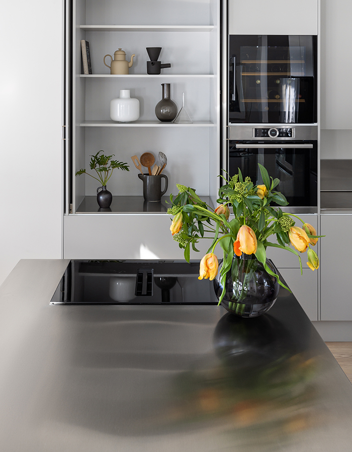 As you enter the apartment, your attention turns immediately to the peaceful sea view. Soft sunlight of early spring floods into the kitchen through the large windows and forms playful patterns on the steel surfaces. In this kitchen, steel has been heavily and uniquely used as a surface material from the island and floating worktop to cabinet doors. The execution and overall look of the kitchen are impressive and elegant. The road to innovation is not always straight. In fact, this magnificent result would not have been possible without resilience and faith in one’s unique vision.