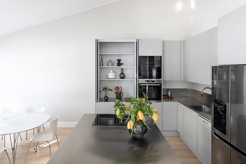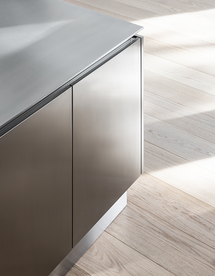 After the establishment of the strong vision, the only thing missing was someone to realise it. Finding a suitable supplier was not easy but, in the end, Blau was chosen as the partner for this project. Some supplier candidates claimed that steel panels of this width are not manufactured and some were prejudiced against the concept of a full-steel island. Prejudiced ideas of steel as a cold and clinical material gave rise to some tart comments, such as: “Why would you want something like that?”. Some candidates suggested replacing steel with thick stone worktops.