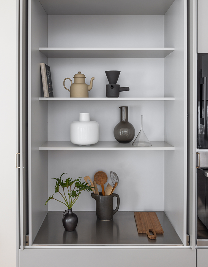 The bottom shelf of the breakfast cabinet is also made of steel. Making coffee is carefree when you do not have to worry about staining splashes.