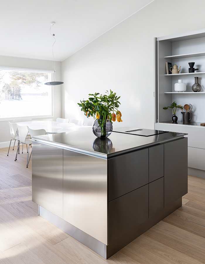 The island is extremely multifunctional. It has plenty of room for cooking and the steel doors conceal convenient storage solutions. In addition, the island plays a key role during social gatherings: you can either sit around the island or use it to serve snacks and drinks.