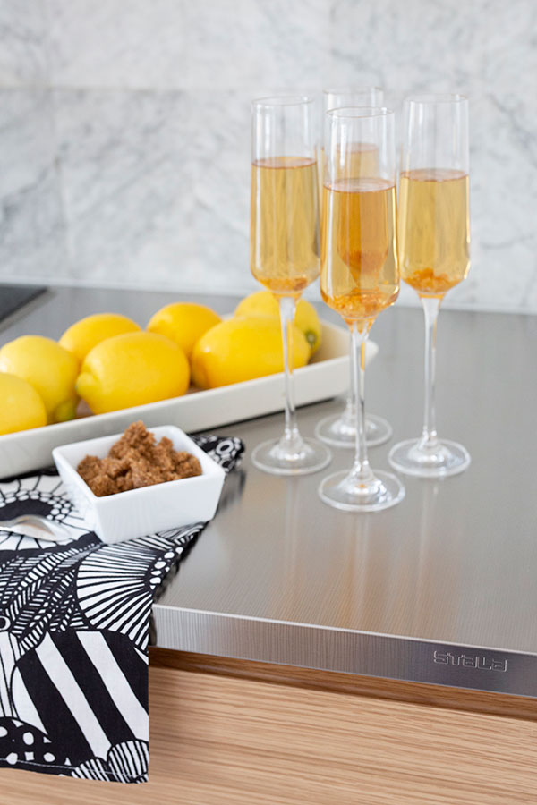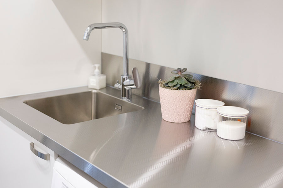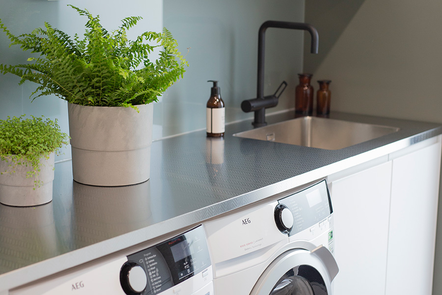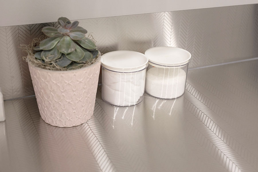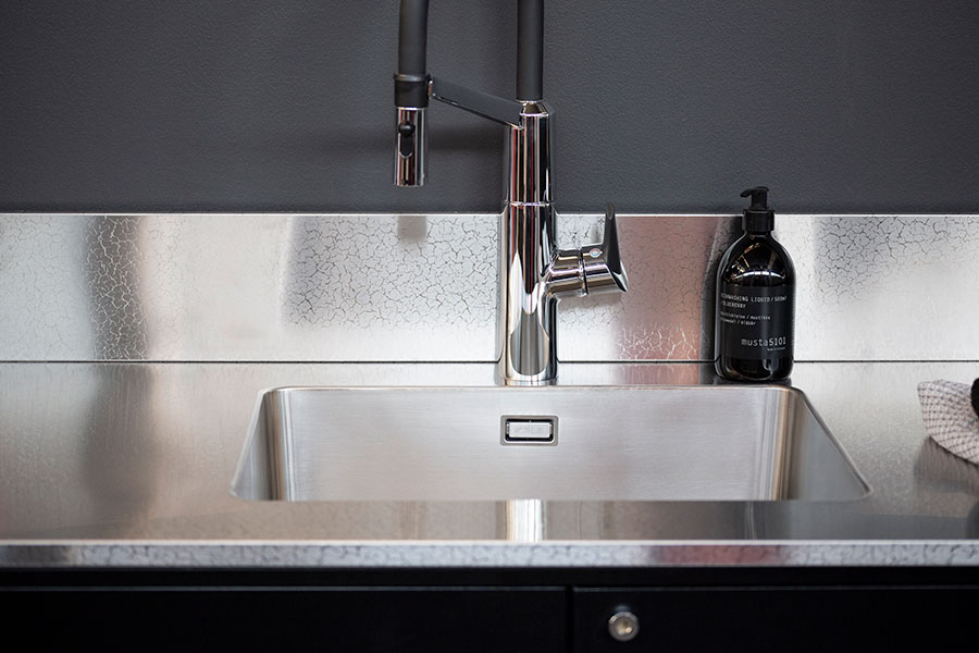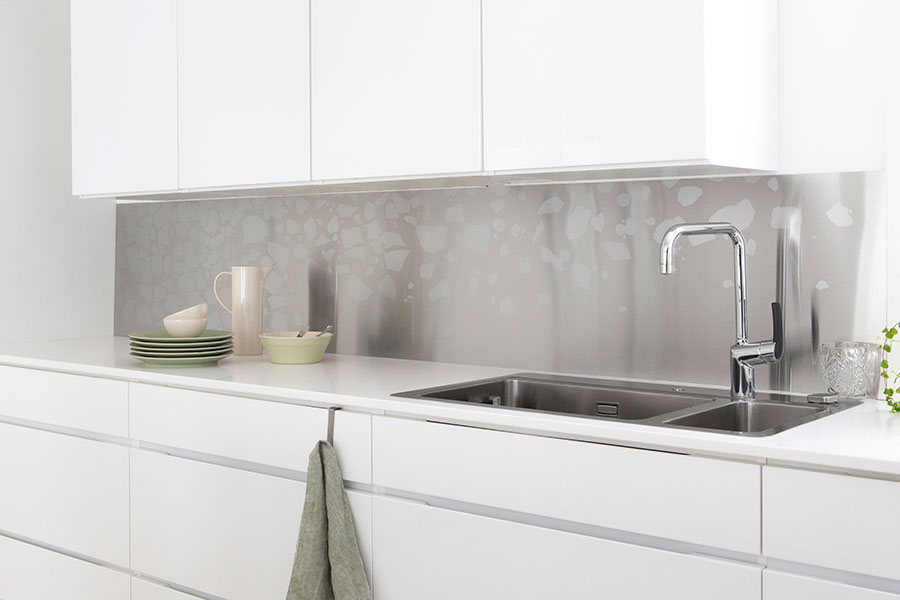 When combining same graphical pattern in worktop and backsplash, it is good to know that thickness of the worktop affects the placement of the pattern. That is why the pattern in the backsplash doesn't necessary meet the pattern in the worktop. It is no object for combining the patterns but is good to know especially if one has a sharp eye for details. See example of a stainless steel worktop M-Seven combined with a US backsplash, both with the pattern Herring.
