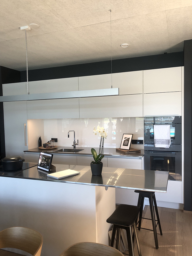 The white Poggenpohl kitchen is part of the living space. The kitchen features stainless steel worktops from Stala's Tailor-made collection.