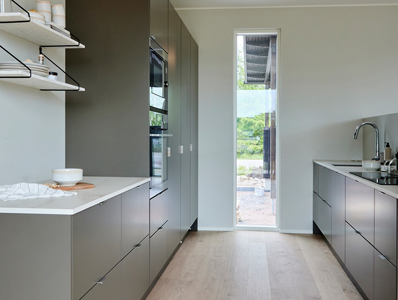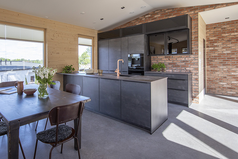 The dark open kitchen consists of melamine doors in a charred wood shade. The black Stala Combo CEG51-57B sink further enhances the color scheme. Contrast is brought to the overall kitchen design with Ylämaan Graniitti worktops and the light-colored interior of the breakfast cabinet. The kitchen is from Novart's collection.