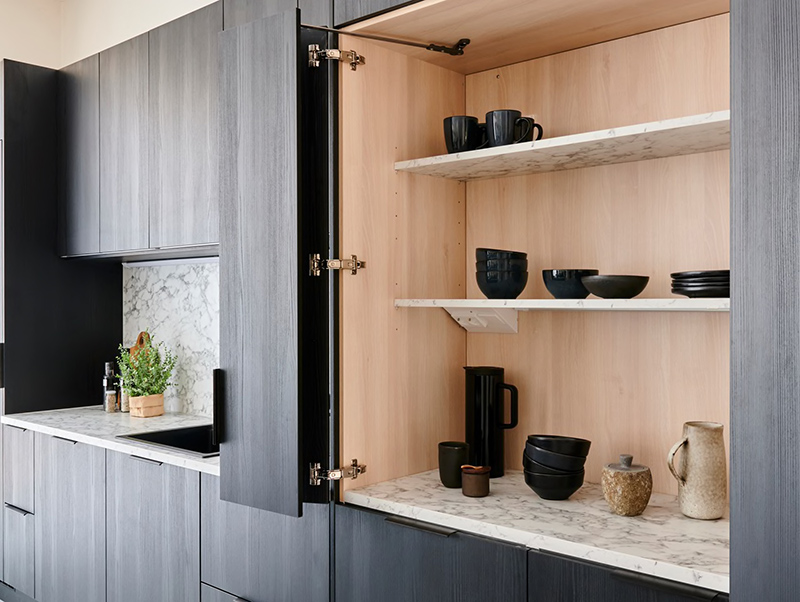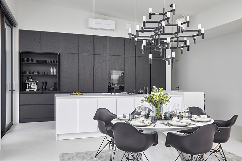 The fitted furniture is from Novart's collection, with the handleless doors in the kitchen sporting the color "Sammal," and Caesarstone Sand as the countertops and backsplash. The kitchen features a fully black Stala Essent CEG-E50B composite sink.