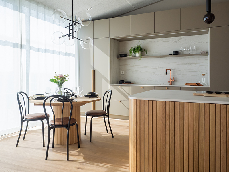 The kitchen island fits perfectly to the staircase steps, and the breakfast cabinet conceals small appliances. The kitchen is from Norrebo, with Cosentino's Dekton Neutral Onirika as the worktops.