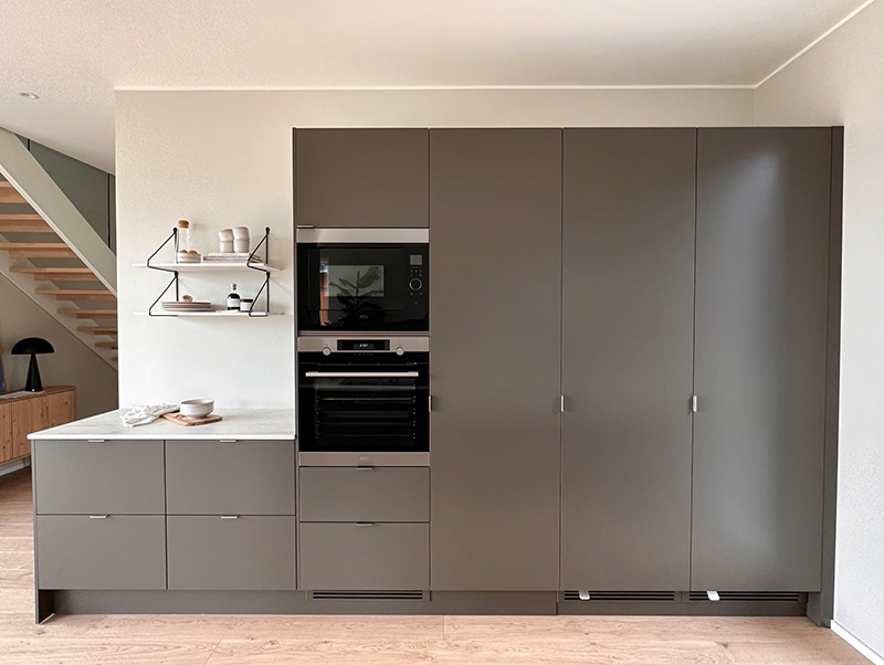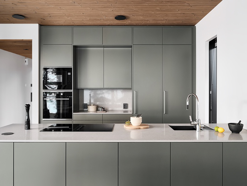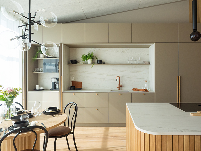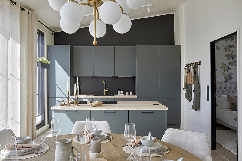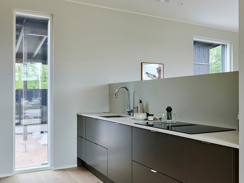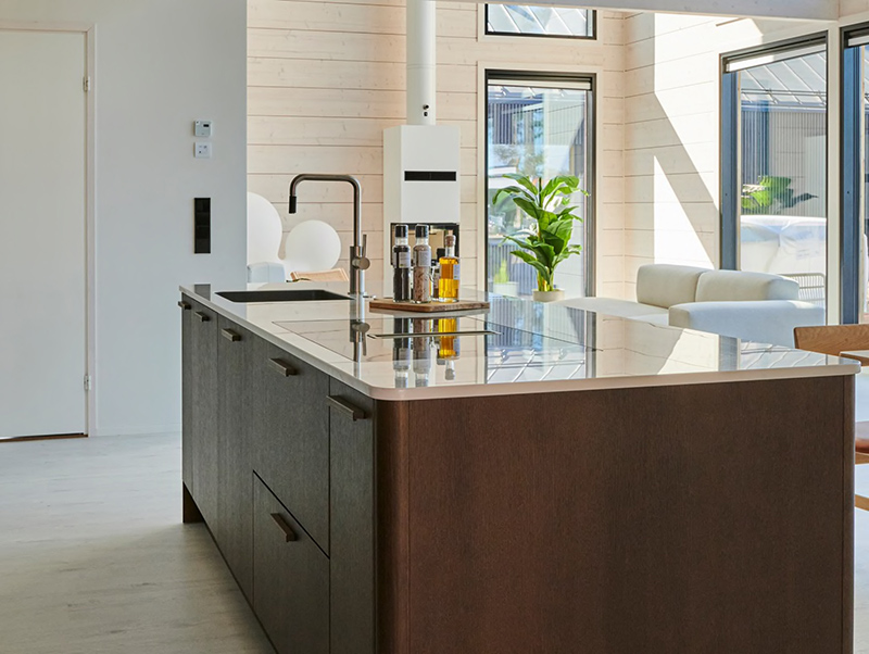 The kitchen embraces nature in its color scheme, with Novart's door model in the shade Kaarna. The Ylämaan Graniitti stone worktop adds ease to everyday life, and the raised island provides a peaceful retreat in the kitchen.