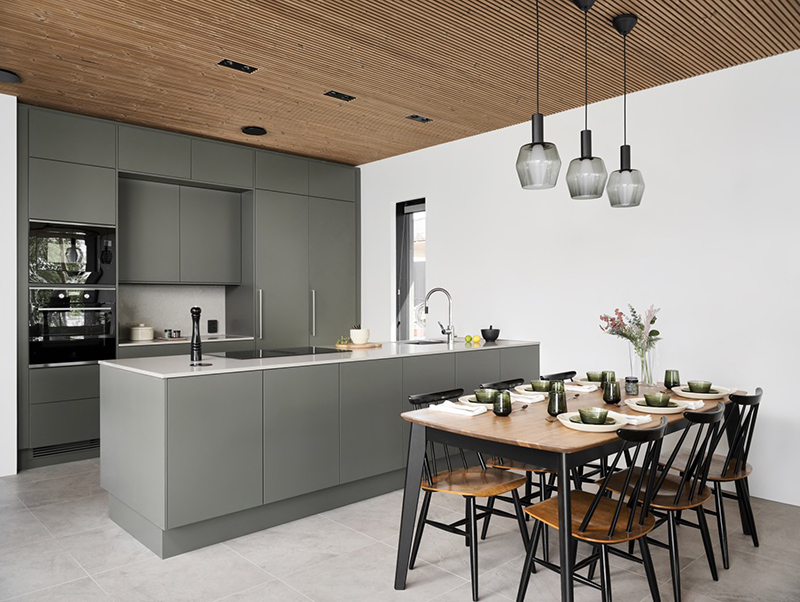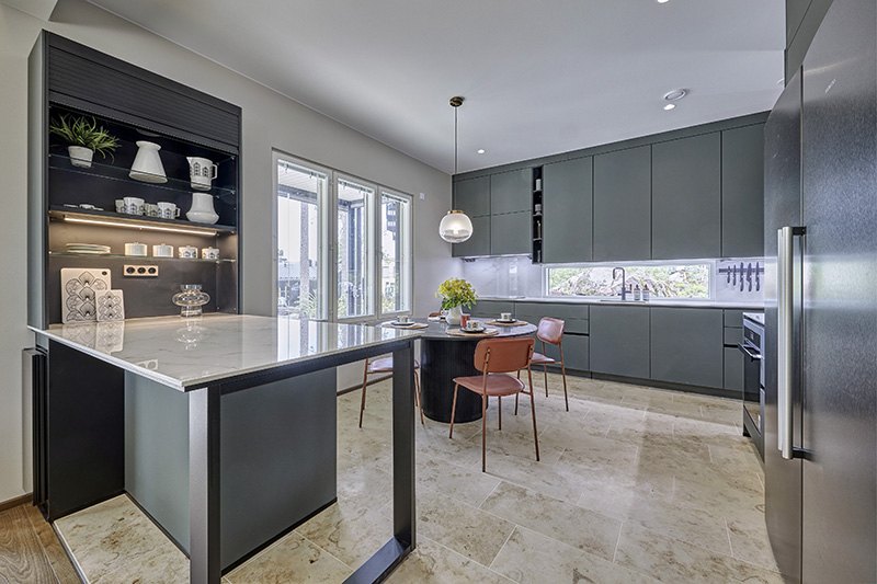 Kitchens have become a permanent part of living spaces. Integrated appliances and breakfast cabinets create clear views. Notable materials included marble-like stone and tile surfaces. The kitchen color schemes were natural and cohesive, ranging from green to white, black, as well as light and dark wood. Stainless steel sinks and black composite sinks were popular choices in both kitchens and utility rooms. Here is a compilation of the most interesting kitchens at the housing fair.