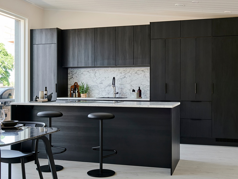 In the Novart kitchen, the doors feature black oak veneer, and the worktop and backsplash showcase the stunning Night Mist granite from Ylämaan Graniitti. The kitchen has two sinks, Stala's Max-50 and Max-30 stainless steel sinks.