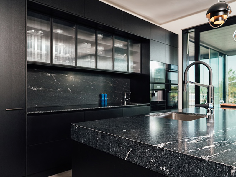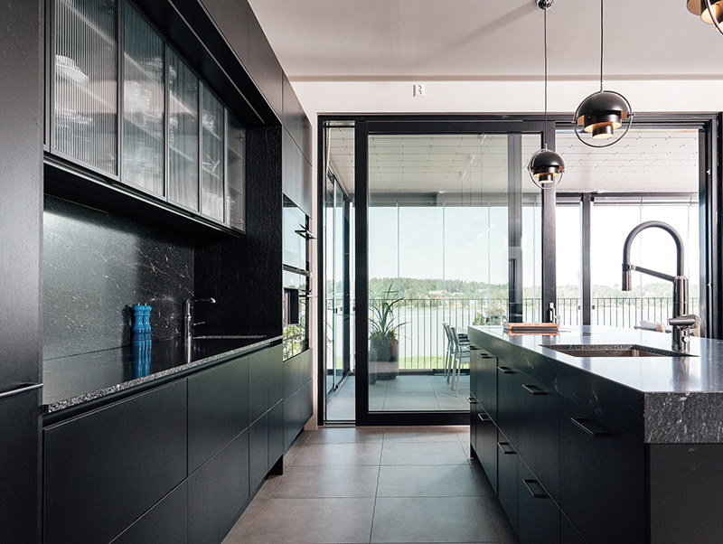 The striking combination of the black and white Noblessa kitchen and the Tulikivi worktop creates an impressive overall look. The sea view shines in the open space.