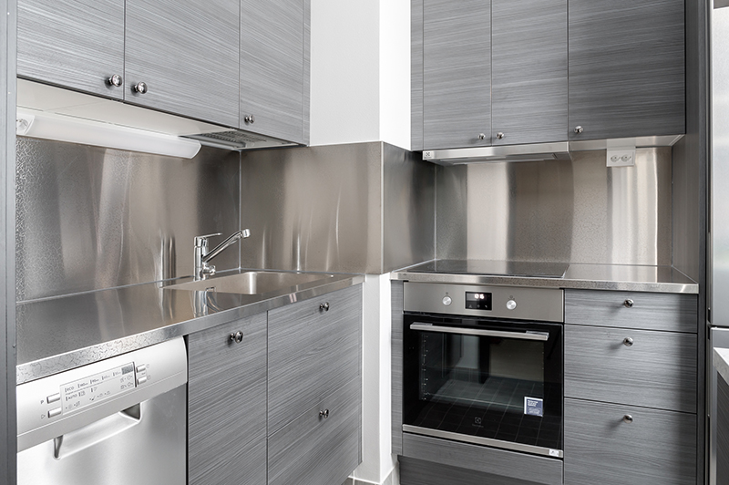 The steel surfaces reflect light and give the kitchen a luxurious look.