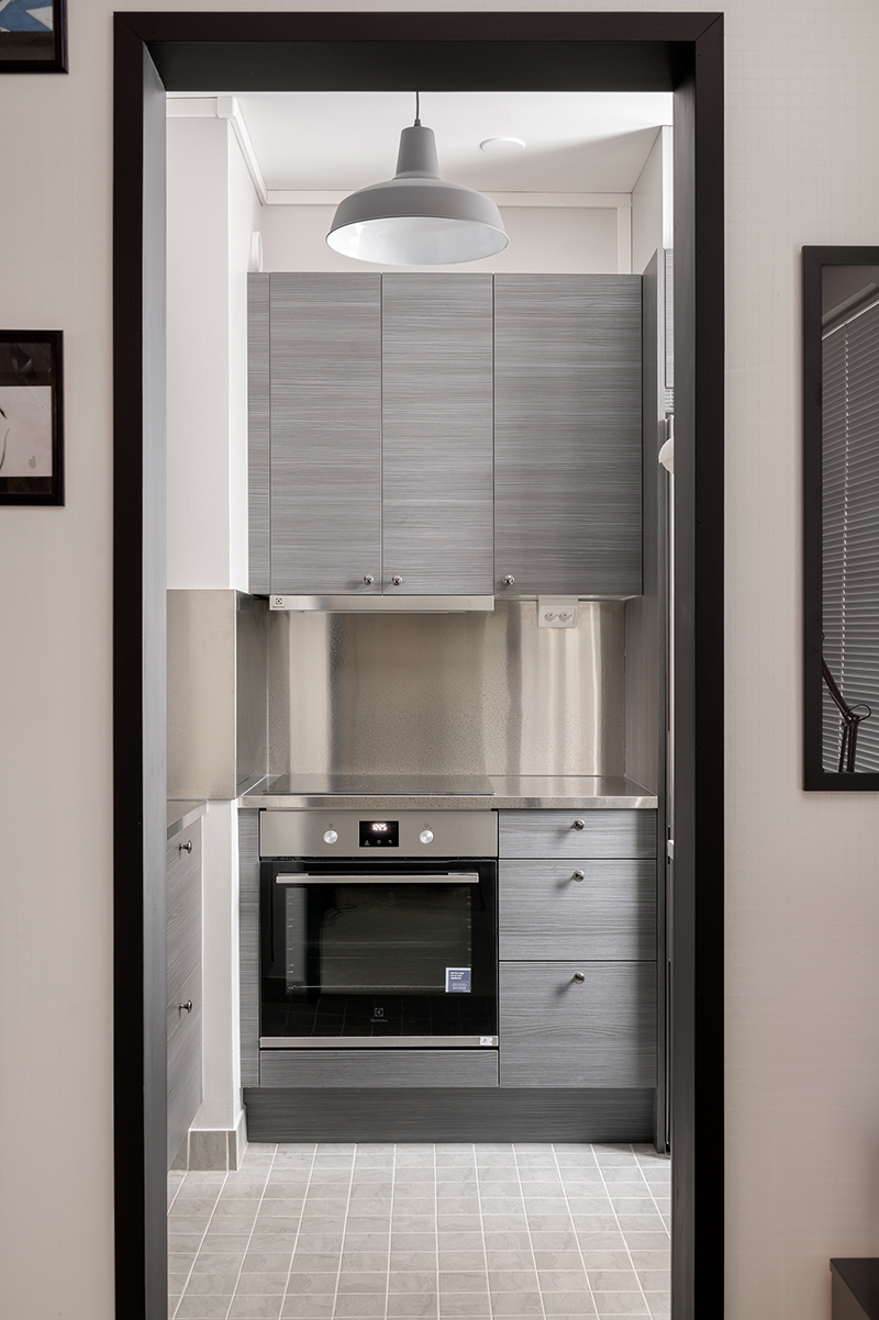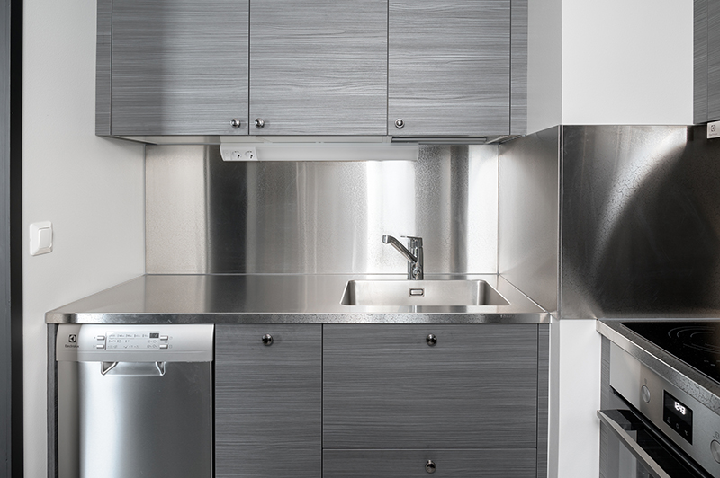 A brand-new kitchen in Tampere is shining with brilliant steel. At first, you see the patterned stainless steel worktops and the backsplash with the same patterned steel continuing on four different walls while reflecting light and giving the entire kitchen a luxurious look. After you have finished admiring that, you notice the kitchen’s other details which give it a finished impression.