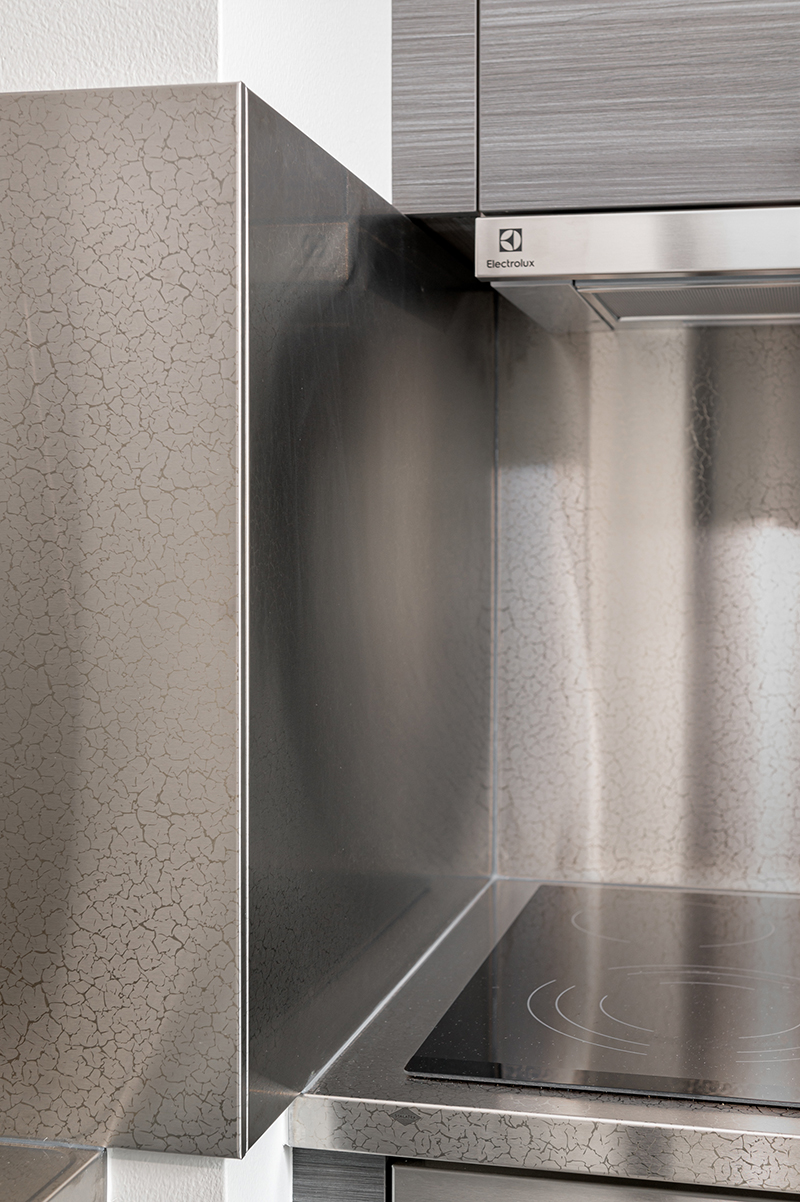 The idea of an easy-to-maintain kitchen that led to the choice of patterned steel surfaces for the backslash led to a brilliant outcome. The steel goes around the range hood and continues on four walls. It reflects a dim light from multiple directions, which gives the kitchen a luxurious feel and makes it seem bigger than it actually is.