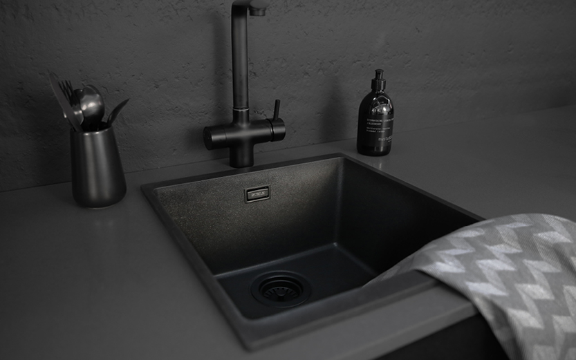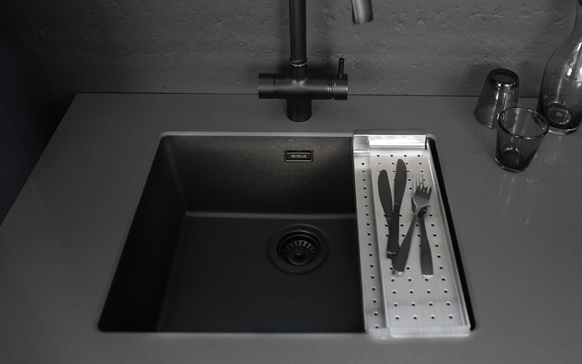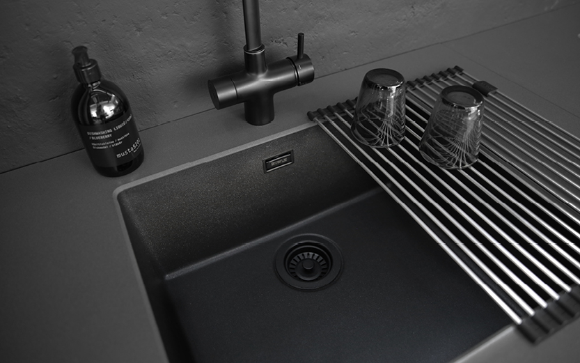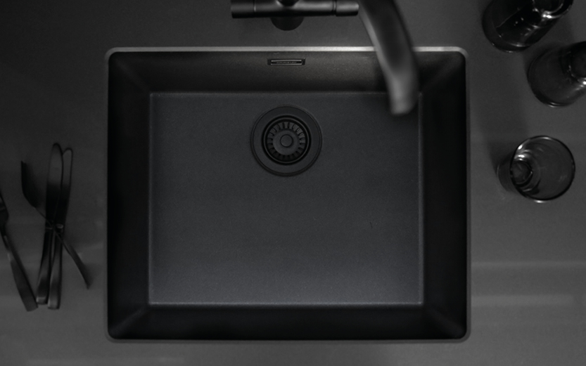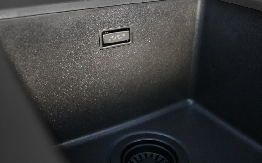 The Stala Essent collection boasts special all-black composite sinks, complete with black details: the overflow, basket drain valve and strainer are all black. Narrow edges round off the stylish look of the sinks. Thanks to their all-black design, these sinks are ideal for modern kitchen interiors.