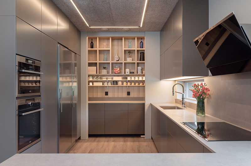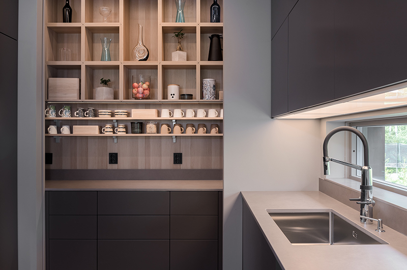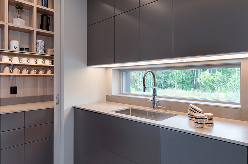 The newly completed, big black detached house together with its outbuildings is a spectacular sight. In this family house, even the smallest details have been taken into account. Functionality has been the driving force when designing the house for the family, and the kitchen is definitely no exception to this.