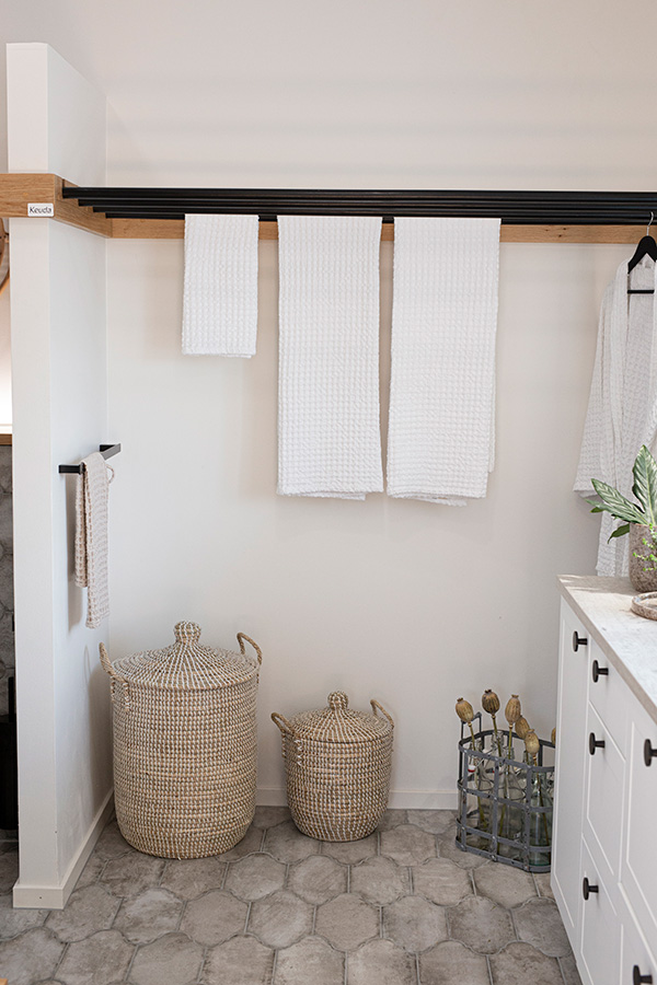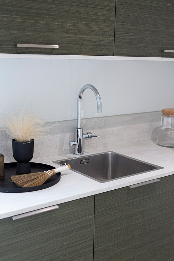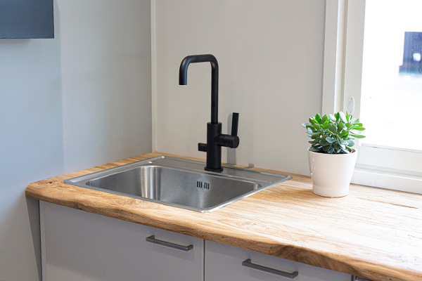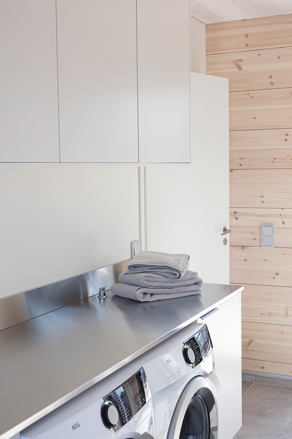Having plenty of worktop space makes the handling of laundry easier. Steel suits the log house well. Thin 20 mm steel worktop is Stala’s Seven.