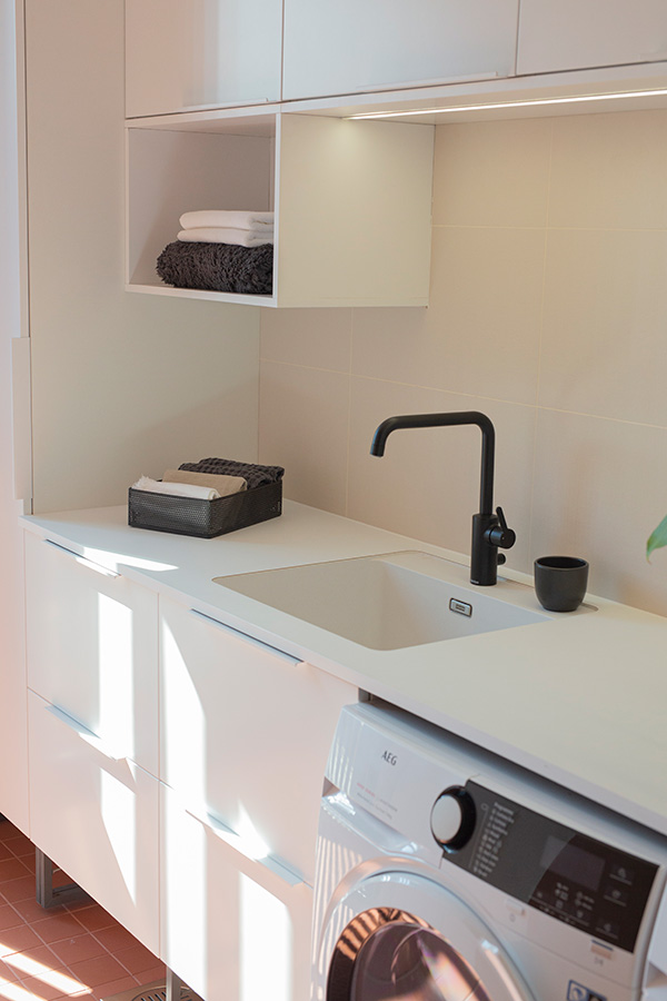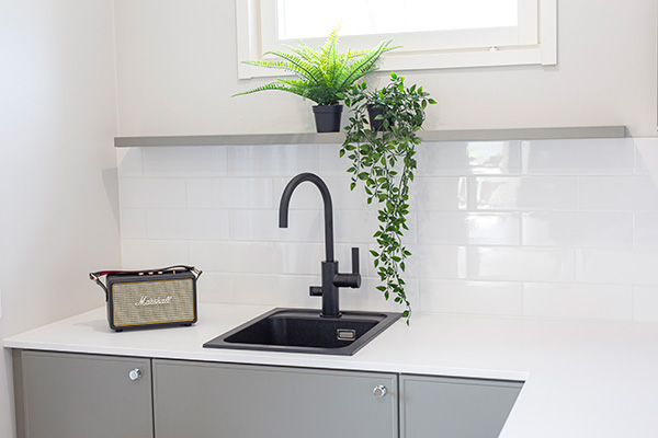Many utility rooms had a black tap and black sink — the small composite sink is Stala’s CEG40-50B