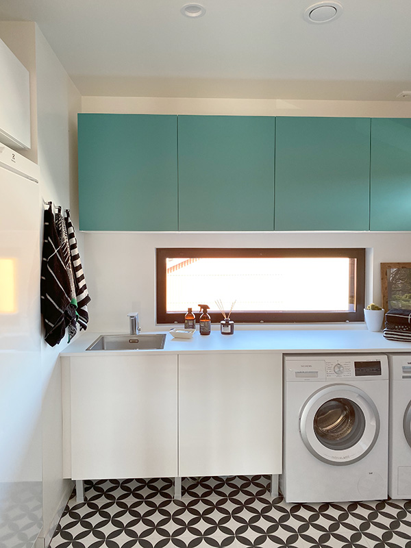 The green upper cupboards bring colour to the utility room while the black details bring order.