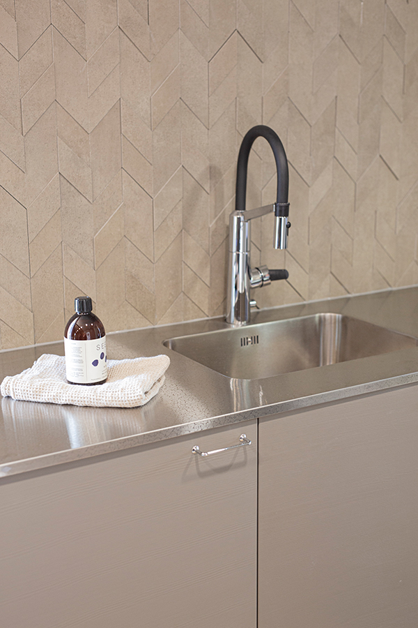 The gorgeous structured wall tiles are impressive — a steel worktop is also suitable for the utility room — the thin StalaTex worktop has the Clay pattern