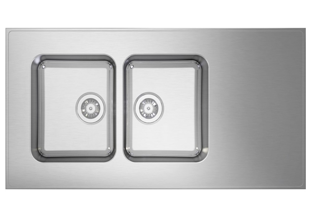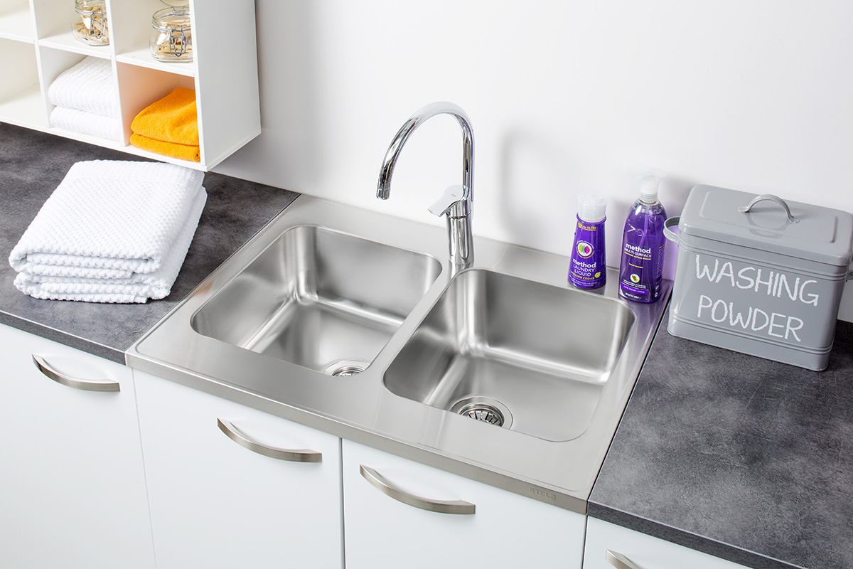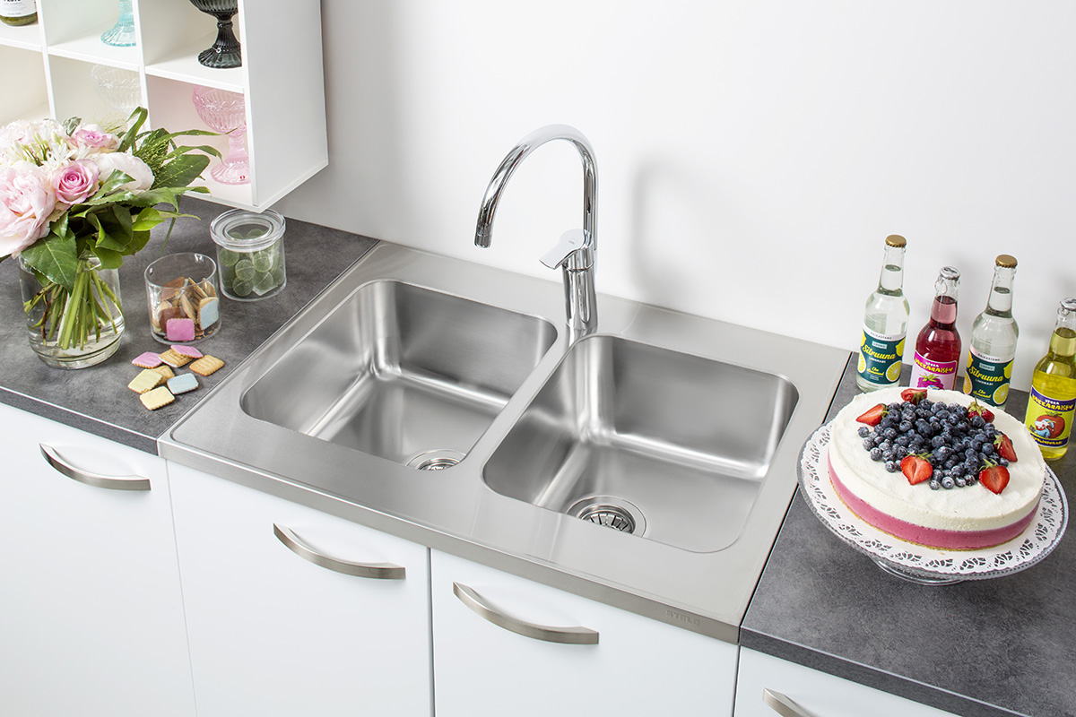 The sink and tap together make up the most important functional area in a kitchen, so the choice for a sink and counter top should be made thoughtfully. Washing dishes is smooth with two large bowls and plenty of additional work space available.