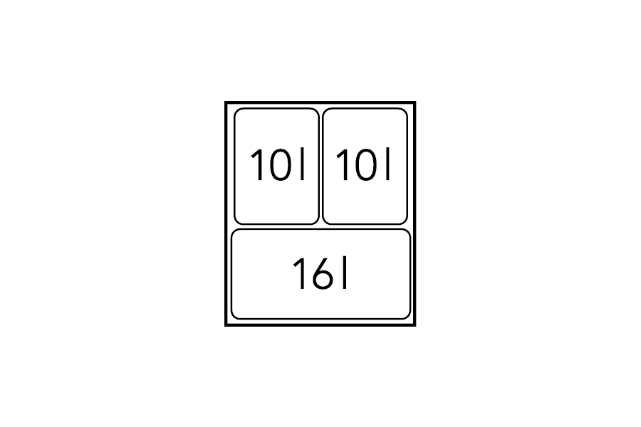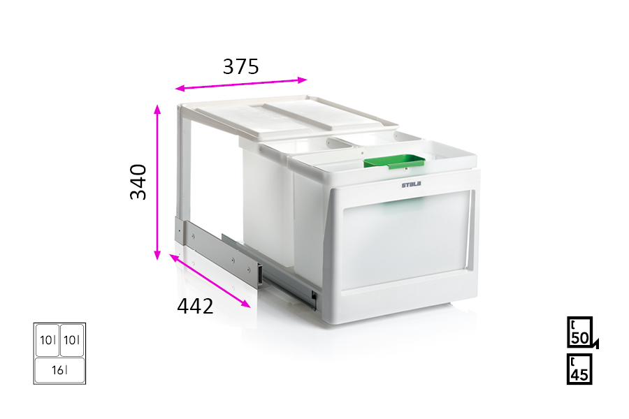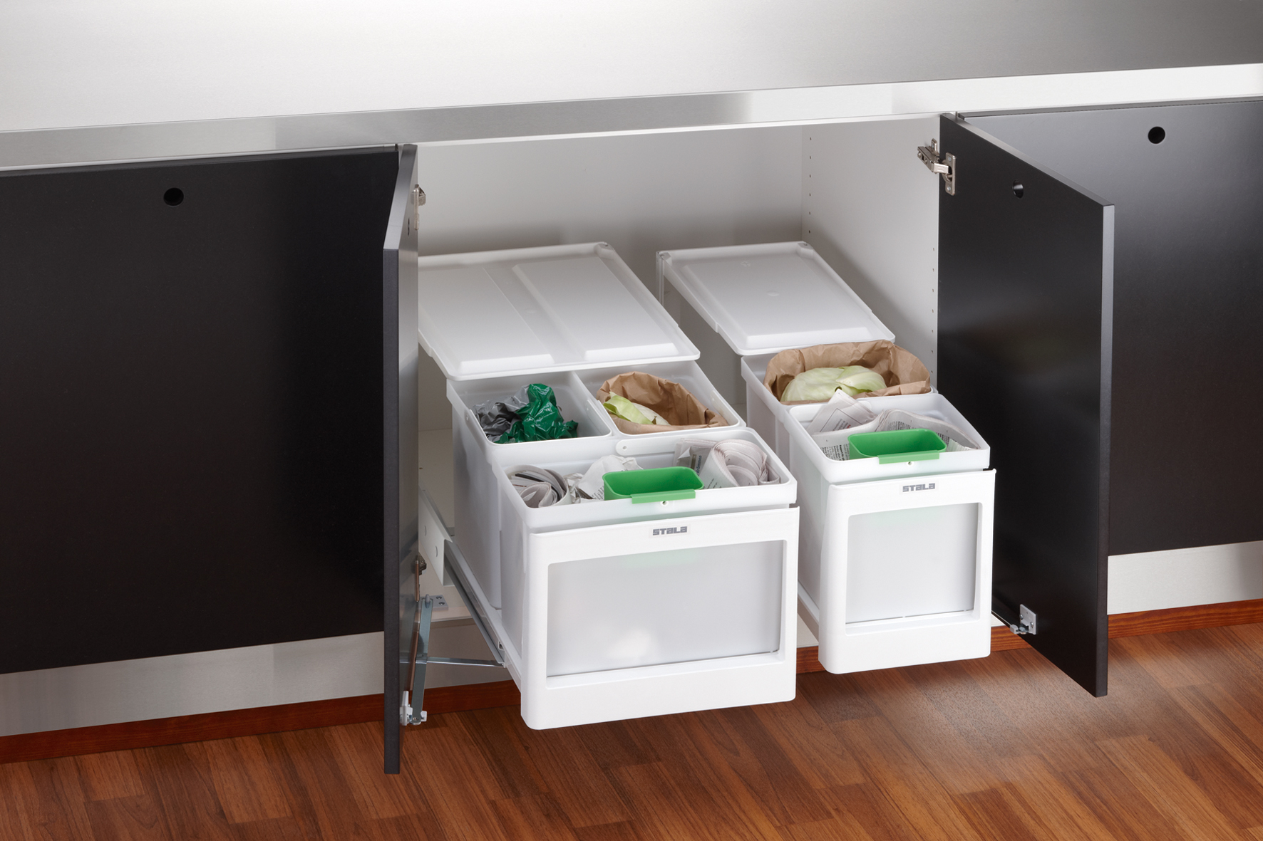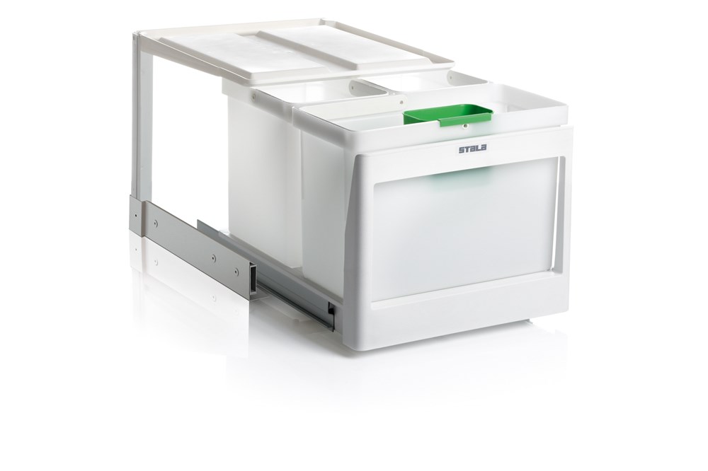 Lidded sliding waste sorting system with two 10 litre bins, one 16 litre bin and a small bin for hazardous waste. Minimun cupboard width is 45 cm without door mechanism.