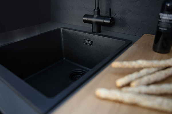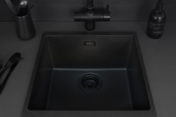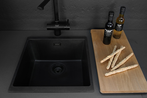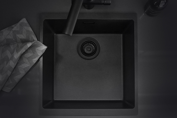 Stala Essent CEG-E40B is an all-black quartz composite sink. The Stala Essent collection boasts special all-black composite sinks, complete with black details: the overflow, basket drain valve and strainer are all black. Narrow edges round off the stylish look of the sinks. Thanks to their all-black design, these sinks are ideal for modern kitchen interiors.