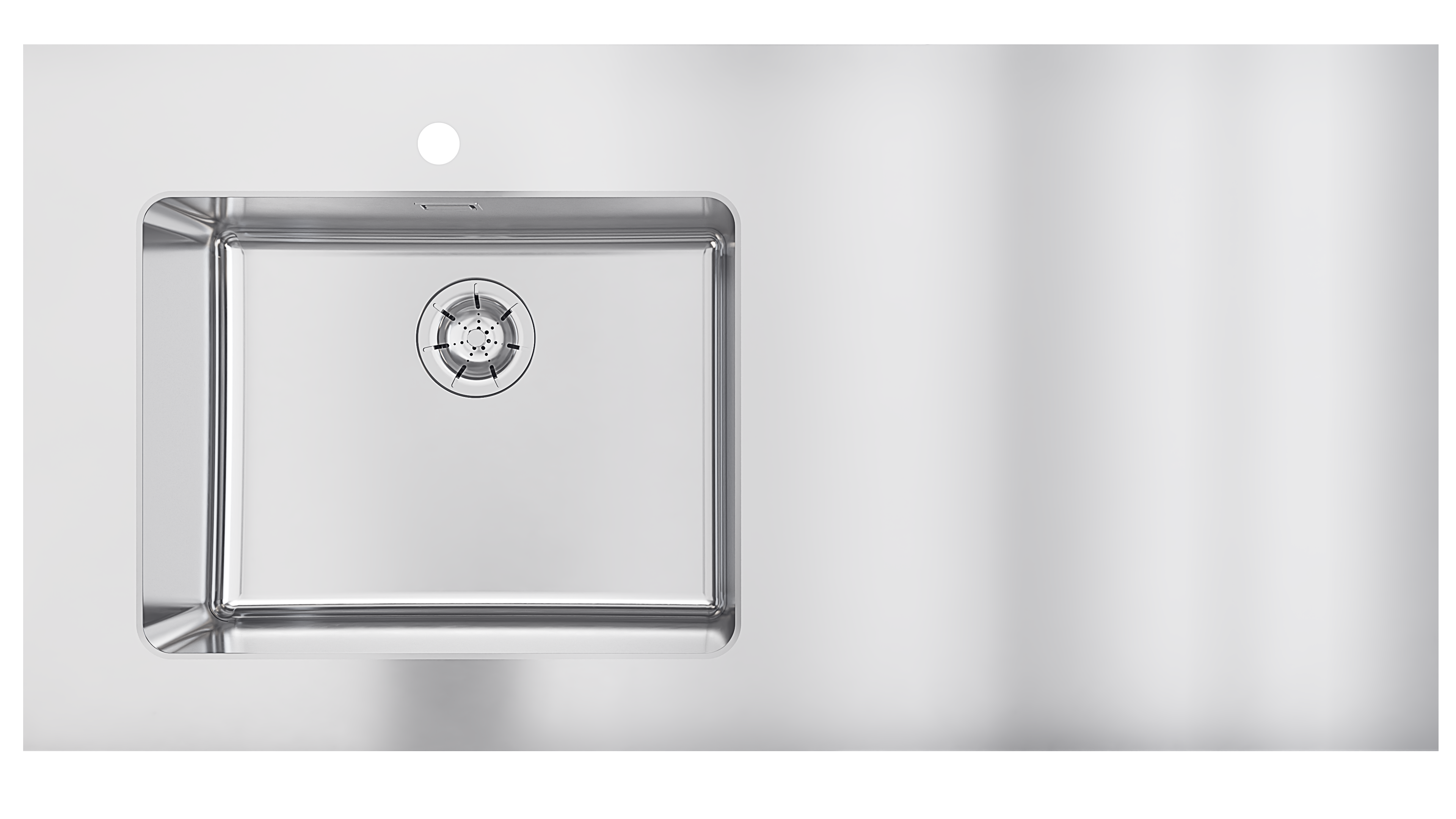 The ONE worktops can also be equipped with a functional area that defines the working area around the sink, helps keep water on the worktop, and enhances everyday usability.