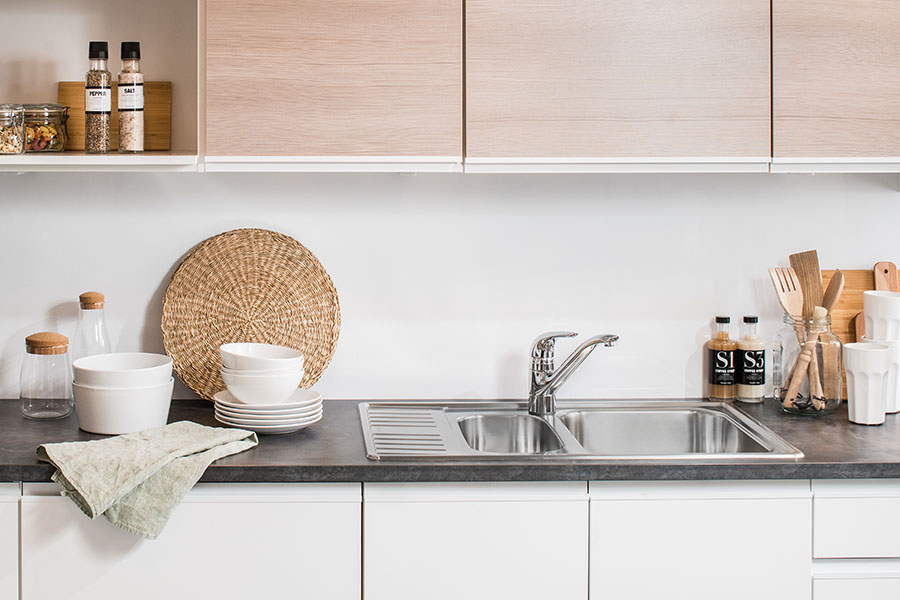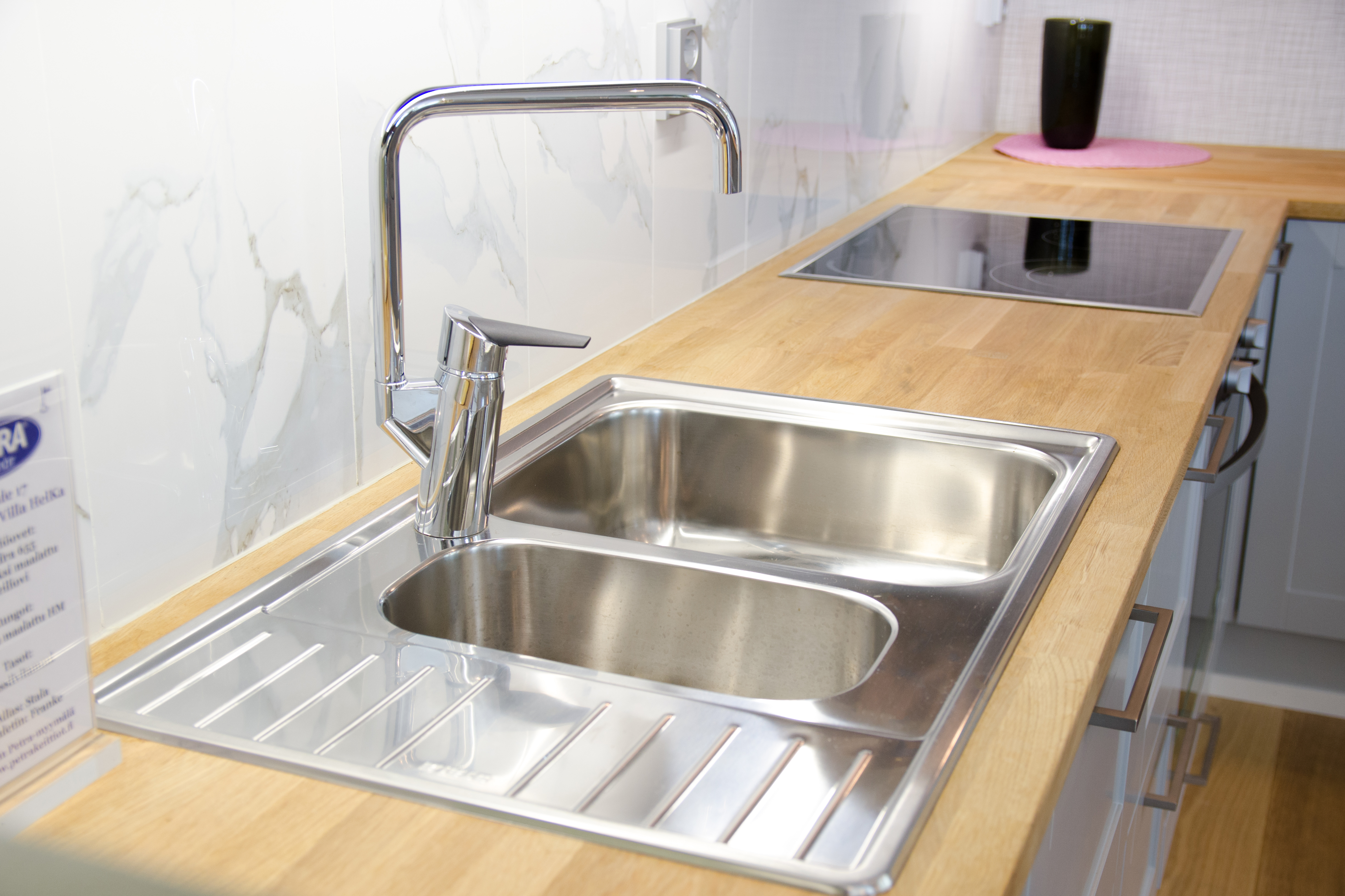 This sink has a sloping drainboard, so that water from dishes flows back into the bowl. Stainless steel sink is hygienic and durable, easy to keep clean.