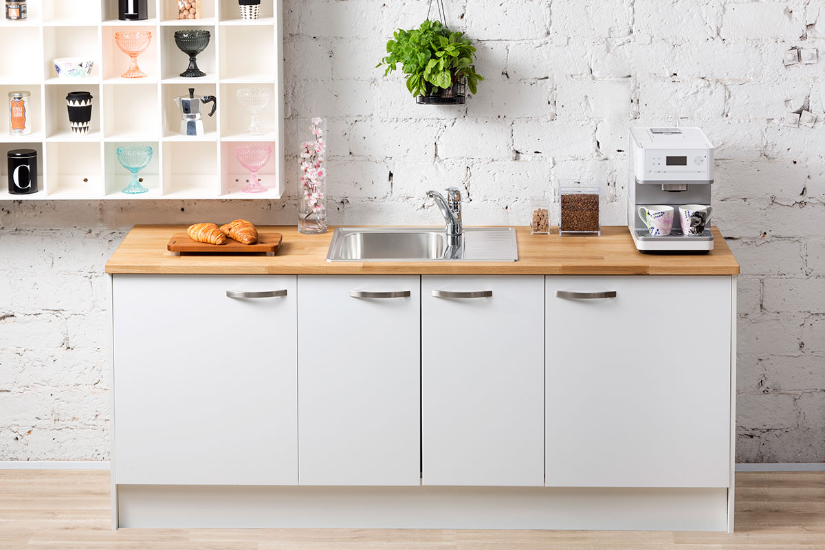 Just right in small spaces, minimum cupboard width is only 45 cm under the sink. Sink depth is 180 mm.