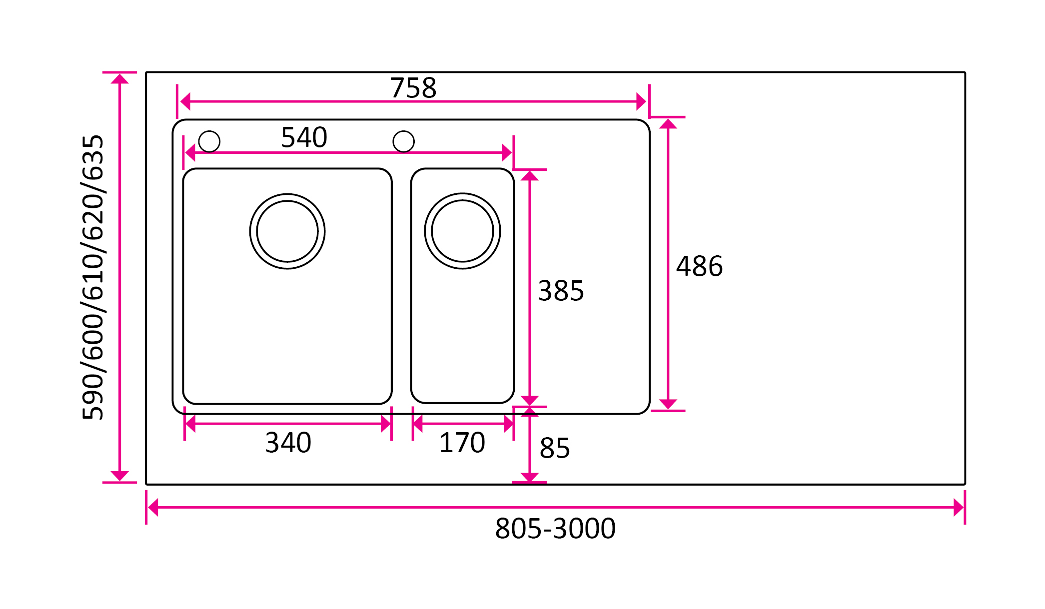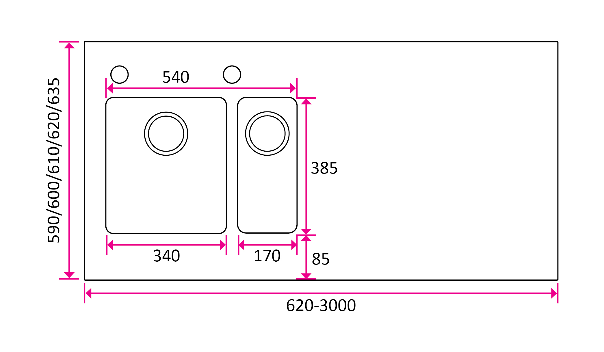 • Dimensions of the main bowl: 340 x 385 x 180 mm; dimensions of auxiliary bowl: 170 x 385 x 150 mm