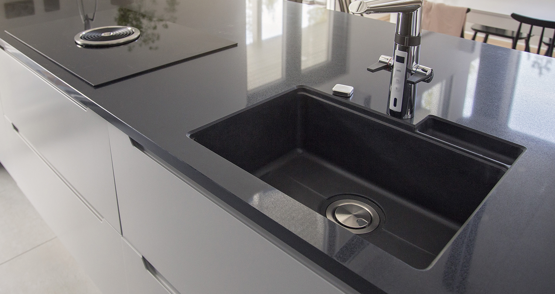 The quartz composite combines beauty and practicality, and its durable structure is perfectly suited for intensive use in the kitchen.