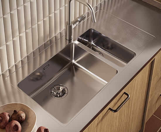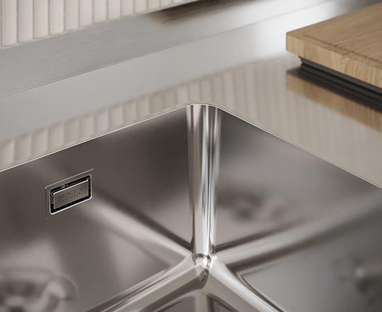 Our dynamic pattern revitalizes the sink's working area. It defines the functional space and reduces the visibility of scratches. The patterning on the work surface is created using Stala's award-winning laser technology.