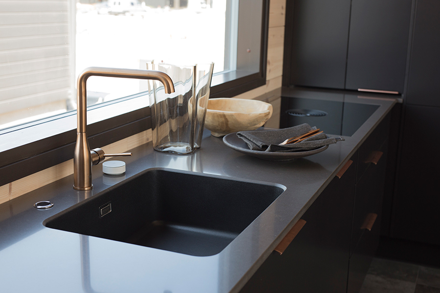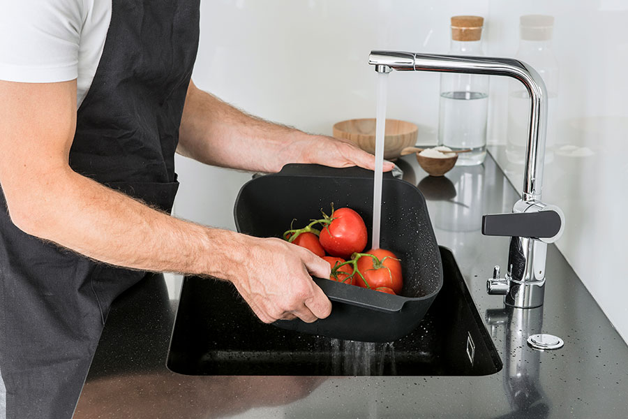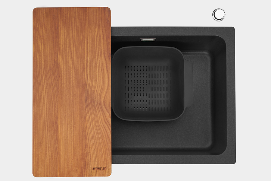 The bottom of the bowl has a special straining area, covered by a larger waste straining plate. The straining plate has a special coating which makes it resistant to dirt and easy to keep clean. The plate is easy to lift by a silicone handle, when you wish to remove food waste from under the straining plate. The straining plate itself can be easily washed, also in the dishwasher. Watch the video of our new composite sink and kitchen accessories!
