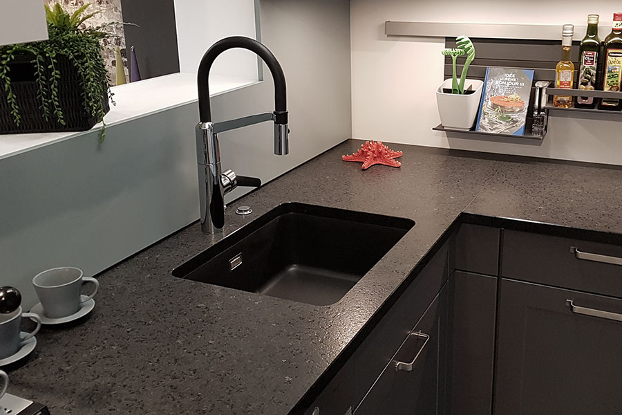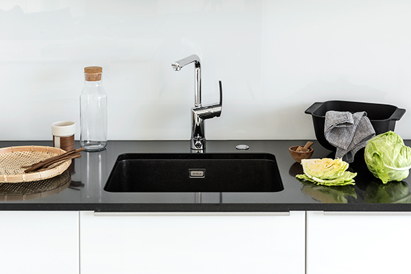 Large and spacious black composite sink. The bowl is made of composite which is a durable material with quartz as the main component. This bowl material endures use and withstands heat well.