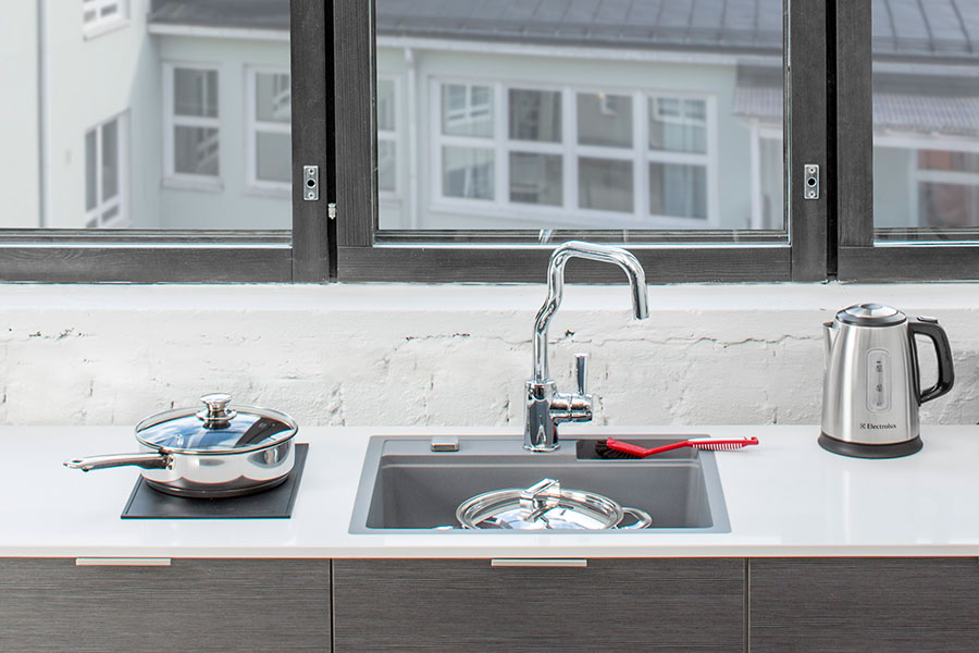 The sink design includes a beautiful shape on the bottom of the bowl, which also improves water flow. The groove on the sink edges ensures the perfect fit for kitchen accessories. You can rinse and chop vegetables or drain your pasta with the draining basket, all at the sink.