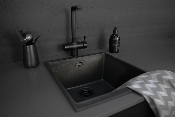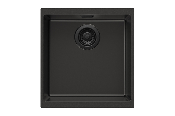 Stala Essent CEG-E40B is an all-black quartz composite sink. The Stala Essent collection boasts special all-black composite sinks, complete with black details: the overflow, basket drain valve and strainer are all black. Narrow edges round off the stylish look of the sinks. Thanks to their all-black design, these sinks are ideal for modern kitchen interiors.