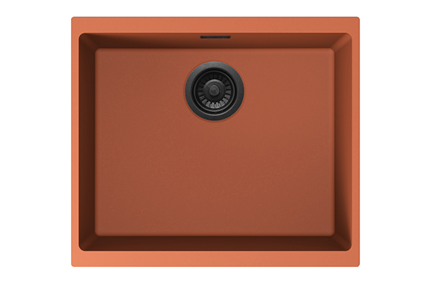 Stala Essent CEG-E50C is clay-colored quartz composite sink. The clay-colored composite sink is complemented by black details: the overflow, basket drain valve and strainer are all black. Narrow edges round off the stylish look of the sinks.